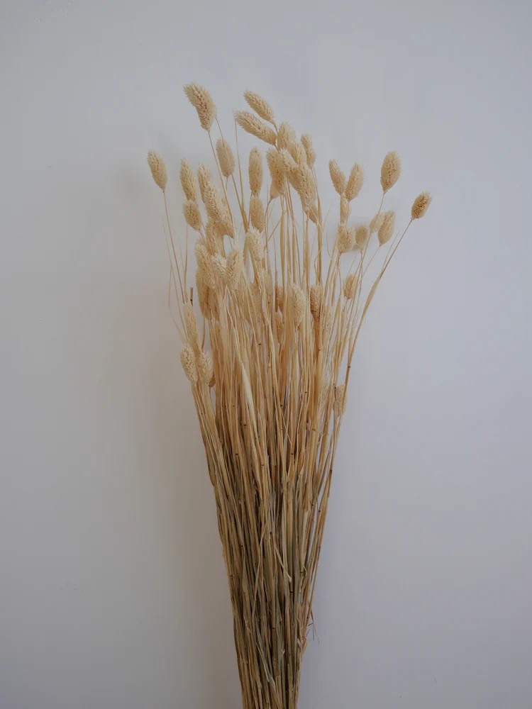 Le Phalaris est un feuillage séché raffiné et texturé, apprécié pour ses petits épis denses qui apportent du rythme et du volume aux compositions végétales. Dans ses tons beige et blanc, il diffuse une ambiance douce et naturelle, parfaite pour sublimer murs et tableaux végétaux avec une note champêtre et élégante. Avec une hauteur de 60 à 70cm, il s’intègre facilement dans toutes les créations florales, qu’elles soient minimalistes ou plus fournies.